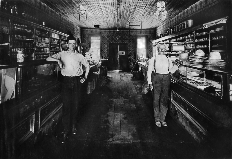 Hugh Boyd (left) in his store in Atoka with Thom Forbess in the early 1920's