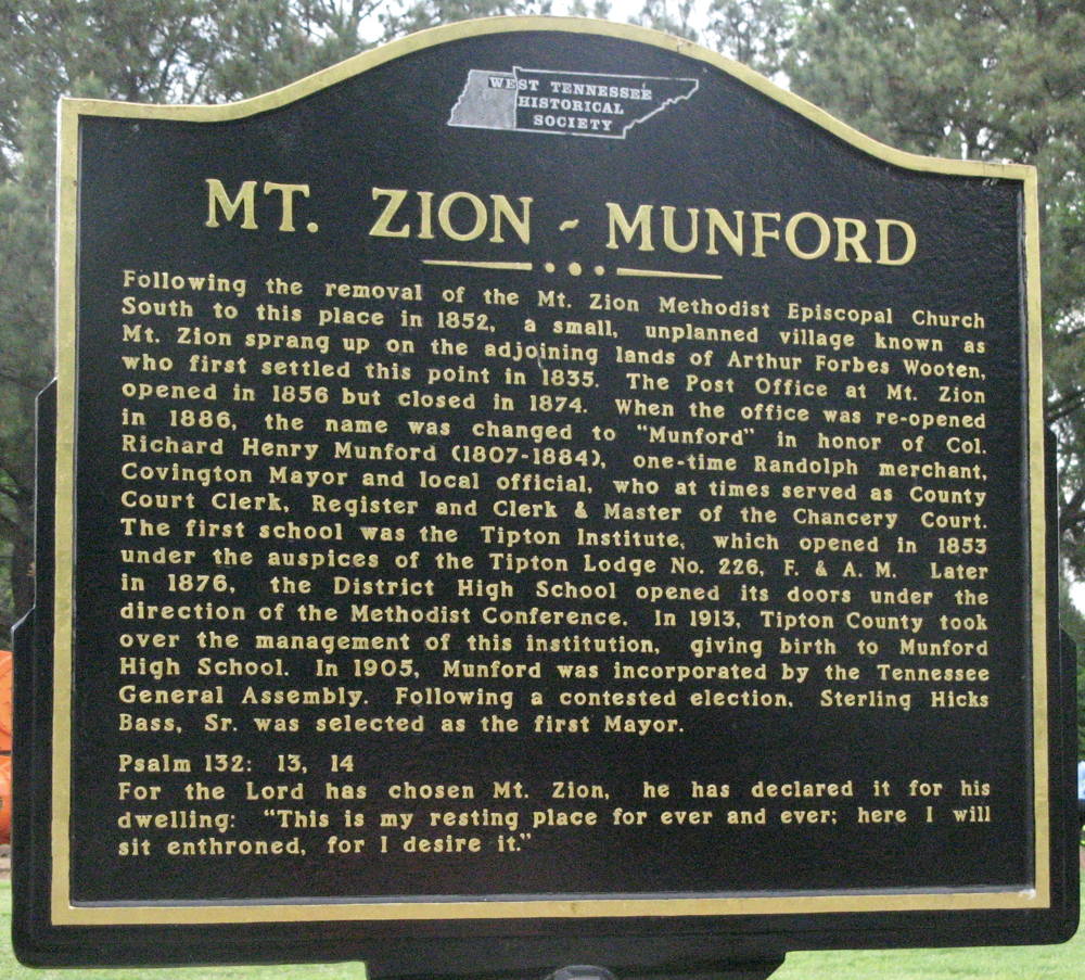 Munford, about 4 miles west of Porterville, was originally Mount Zion. In the early 1850s the Mt. Zion Methodist Episcopal Church moved to the current site of the Munford Presbyterian Church. The community that grew up around the Methodist church was also known as Mt. Zion. In 1853 the Tipton Lodge No. 226 of the Free and Accepted Masons was founded in Munford.